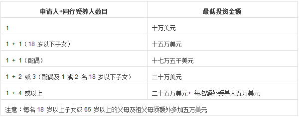 注:1、除了以上投资金额外,主申请人还须支付七千五百美元作为背景审查的费用。如同行的受养人年满12 岁,亦须支付有关费用。配偶的背景审查费用与主申请人相同,12 至16 岁受养人的背景审查费用为二千美元,16 至25 岁或65 岁以上受养人的背景审查费用为四千美元。
