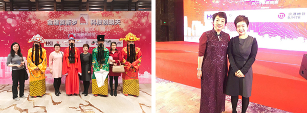 中国香港(地区)商会会长萧惠君女士(左)与瑞丰德永集团北京公司副总经理张春莉女士(右)在晚宴现场亲切交谈,共话发展