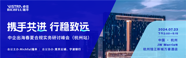 “携手共进,行稳致远:中企出海春夏合规实务研讨峰会”活动于今日7月23日下午在杭州钱江新城万豪酒店成功举办。本次峰会由Richful瑞丰发起和主办,联合Vistra卓佳、竞天公诚、宁波银行协办,吸引了近百位来自华东地区的企业高管报名参会。