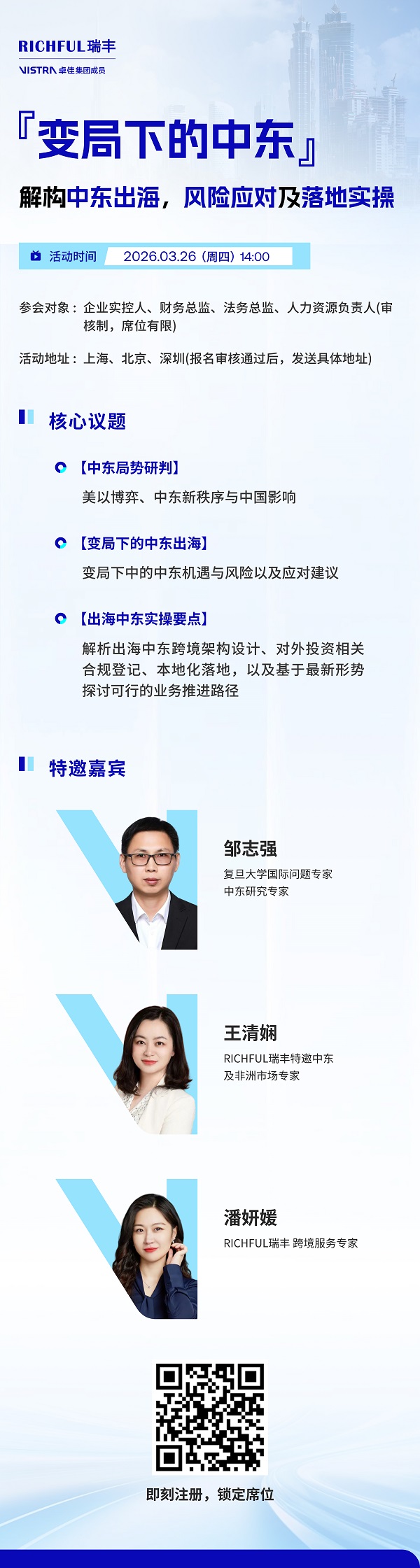 我们特邀复旦大学国际问题专家、中东研究学者,以及具备丰富中东市场实务经验的专家,结合宏观研判与落地实操,围绕地区安全态势、跨境投资架构、合规登记与本地化运营等关键议题展开深度解析,助力企业在中东变局中稳健前行、行稳致远。
