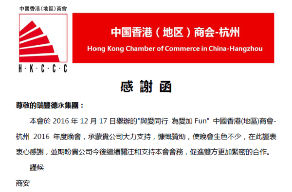 一直以来,瑞丰德永集团与中国香港商会保持着密切合作和友好关系,共同为促进内地和香港两地的双向经贸交流而努力。2017年,瑞丰德永集团将继续立足于香港,与中国香港商会一起,为中国企业国际化发展提供一站式综合咨询服务。