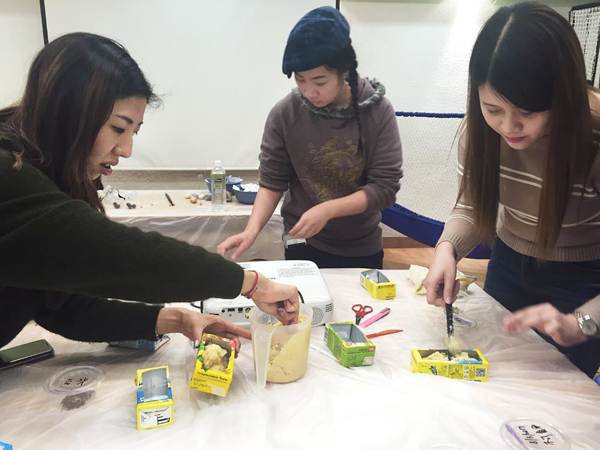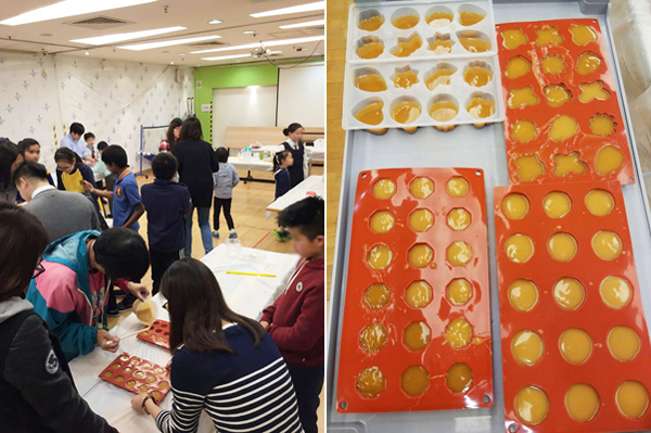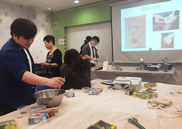 瑞丰德永集团义工先向专业导师学习制作环保肥皂的方法,随后协助导师一起教导小朋友。