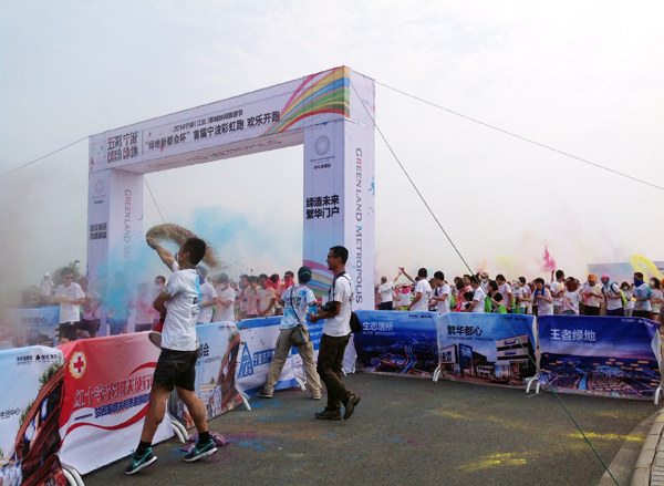 首届宁波彩虹跑在五彩缤纷的粉末中绚烂启幕。瑞丰德永宁波公司的员工早早来到活动现场,与其他跑者一样身着统一的白色T恤,从起点出发,跑完环中心湖七个彩虹站共3公里路程后,大家全身上下都像调色板一样色彩缤纷,绚烂如虹,活动现场成了一片欢乐的海洋!