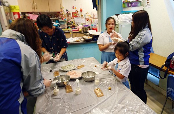 另一边大家都留心听导师的教导,瑞丰义工团协助小朋友制作冰皮月饼,其乐融融。