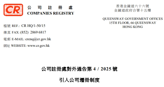 2025-05-23 16:53:44《公司条例》(第622章)已作出修订,引入新的公司迁册制度,让非香港法团迁册来港。在《2025年公司(修订)(第2号)条例》(下称《修订条例》)内的相关法例修订,已于2025年5月23日实施。