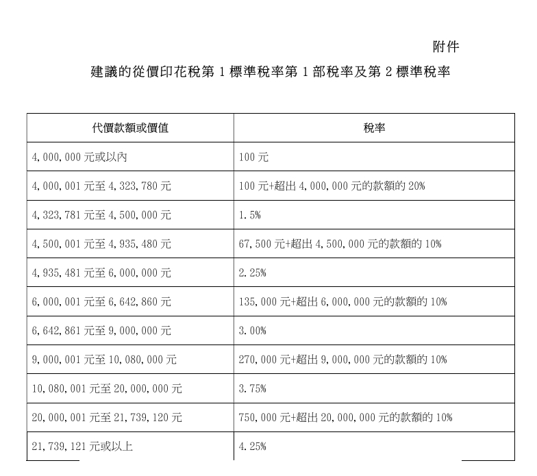 买卖或转让住宅或非住宅物业的文书须按物业售价或价值(以较高者为准)缴付从价印花税。最低的从价印花税税率为一百元,适用于售价或价值为三百万元或以下的物业。经调整后,售价或价值为四百万元或以下的物业须缴的从价印花税一律为一百元。计及特别宽减后,预计调整将惠及约百分之十五的物业成交个案,政府收入每年减少约四亿元。调整后的税阶见附件。新税阶适用于二零二五年二月二十六日或之后签立的文书。