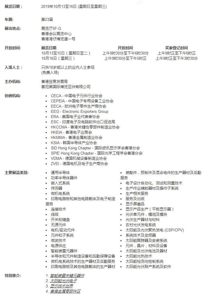 国际电子组件及生产技术展2019为供应商创造一个高效环境,与来自全球电子行业买家作更紧密的联系。2018年,国际电子组件及生产技术展与香港贸发局香港秋季电子产品占组成了全球最大电子平台,吸引来自139个国家和地区,近87000名买家进场参观洽商。