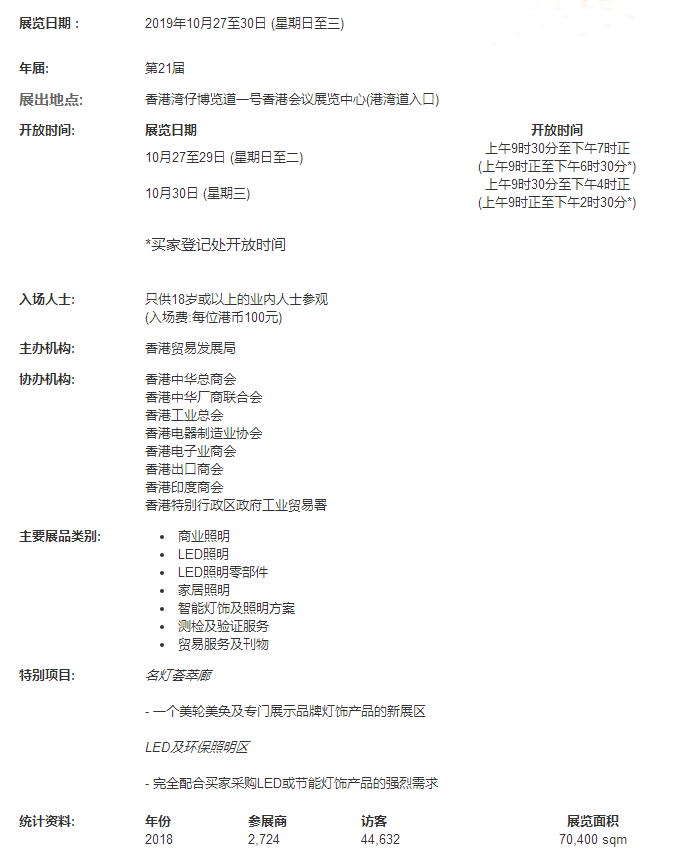 香港国际秋季灯饰展2019(秋季展)提供绝佳的展示平台,让各式各样照明产品供应商直接联系国际买家。秋灯展与香港贸发局香港国际户外及科技照明博览皆由香港贸发局主办,合组成全球最大的灯饰及照明产品商贸平台。2018年秋灯展汇聚2700家来自37个国家及地区的参展商,与逾44600名买家洽商。