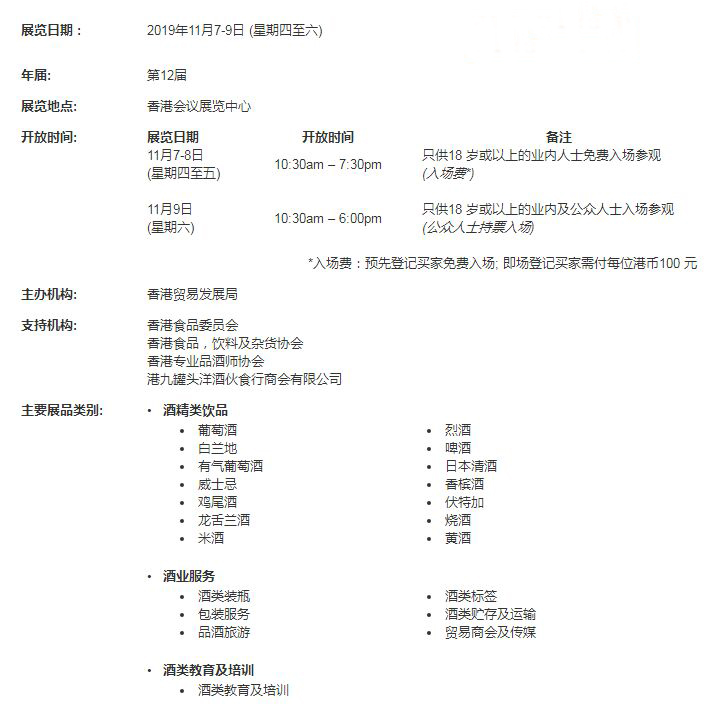 由香港贸易发展局主办的第十二届香港国际美酒展(美酒展)于2019年载誉重来,再度展出各种各样香醇佳酿,为业界缔造超乎所想的发展机遇。这项备受瞩目的盛会已成为不可多得的美酒交易和采购平台,展览为期三天,将假湾仔香港会议展览中心举行,汇聚来自世界各地优质葡萄酒和烈酒业界有影响力的买家、专家和品酒大师。美酒展于2018年吸引来自73个国家及地区,近1万9千名买家入场参观,进一步巩固香港作为葡萄酒贸易中心的领先地位,同时确保一千多家优质国际参展商取得丰硕成果,开拓商机。