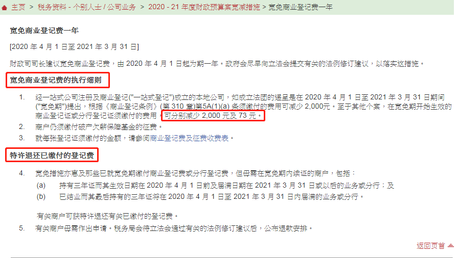 同时税务局于41日发布通知,宽免公司商业登记费(特许退还已缴费的登记费),为期1年。如成立法团的递呈是在2020 4 1 日至 2021 3 31 日期间(“宽免期”)提出,根据《商业登记条例》( 310 ) 5A(1)(a) 条须缴付的费用可减少 2,000 港元。
