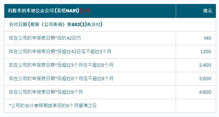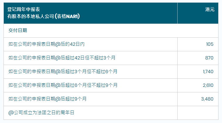 相关费用:私人公司、担保有限公司费用为105港元,公众公司为140港元。若逾期递交,则按5个梯度进行??睿词凳┙细叩牡羌欠?。