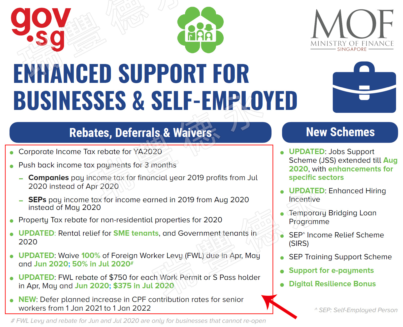 ● 2020年4月~6月,对已获工作许可证或S pass的外国职工,每人返还750新币,7月返款375新币
