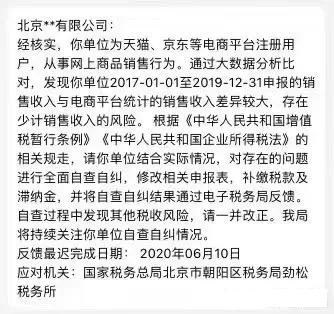 近日,多家经营京东、淘宝/天猫网店的店主向媒体表示,在5月收到了当地税务局部门的“风险自查提示”,对他们存在的少记营业收入风险进行提示,并要求自查从2017年至2019年存在的漏报问题并补缴税款以及滞纳金。