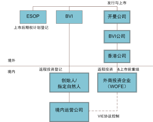 以上述框架为例,在BVI控股外商投资企业中间,还设立了一个香港公司,再经由香港公司在国内注册设立一个外商投资企业(WFOE)。