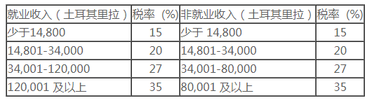 土耳其个人所得税税率介于15% 35% 之间,按照超额累进制征收,具体税率如下表。