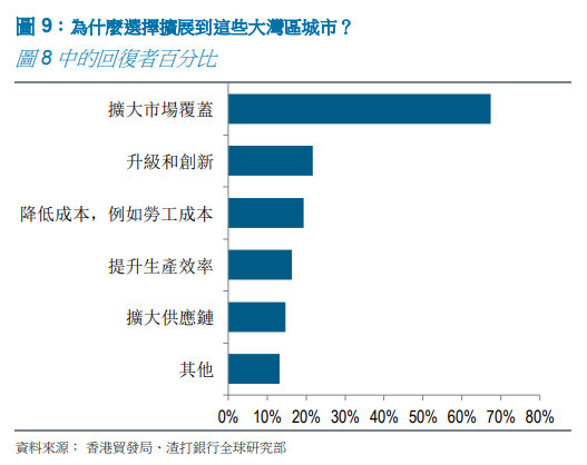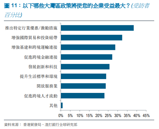 接下来的两个选择是「巩固国际贸易和投资关系」与「增强基础设施和跨境交通运输连通性」,表明港澳、与珠三角之间生产要素中必不可少的金融服务、与跨境连通性的重要意义。