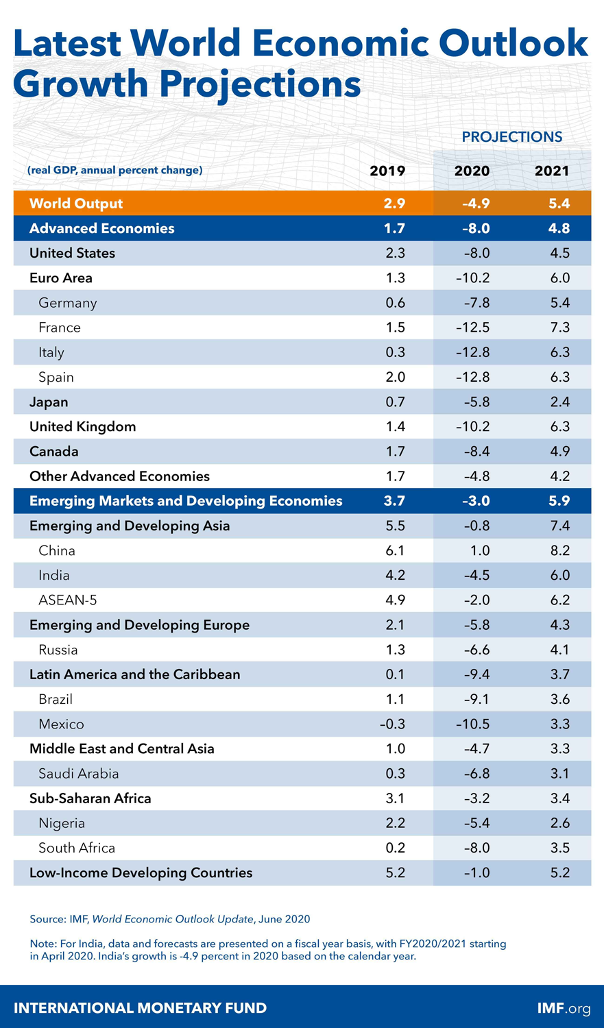 新冠肺炎疫情在全球的蔓延对世界经济形成重大冲击,国际货币基金组织(IMF)6月发布了《世界经济展望》报告,预计2020年全球GDP增速为-4.9%,此前预期为-3%,全球经济主要贡献国的GDP增长预期几乎均为负数。