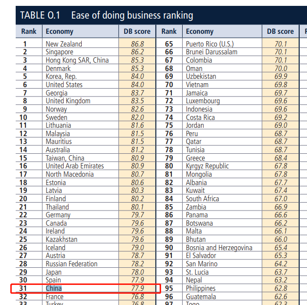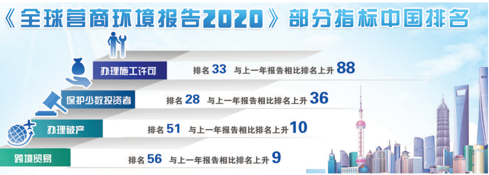 根据世界银行发布的 2020 全球营商环境报告,中国在全球的排名大幅提升15位,跃居第31 位,值得一提的是,过去两年,中国的排名前进了47个位次,并且连续两年跻身全球十大“进步最显著经济体”。