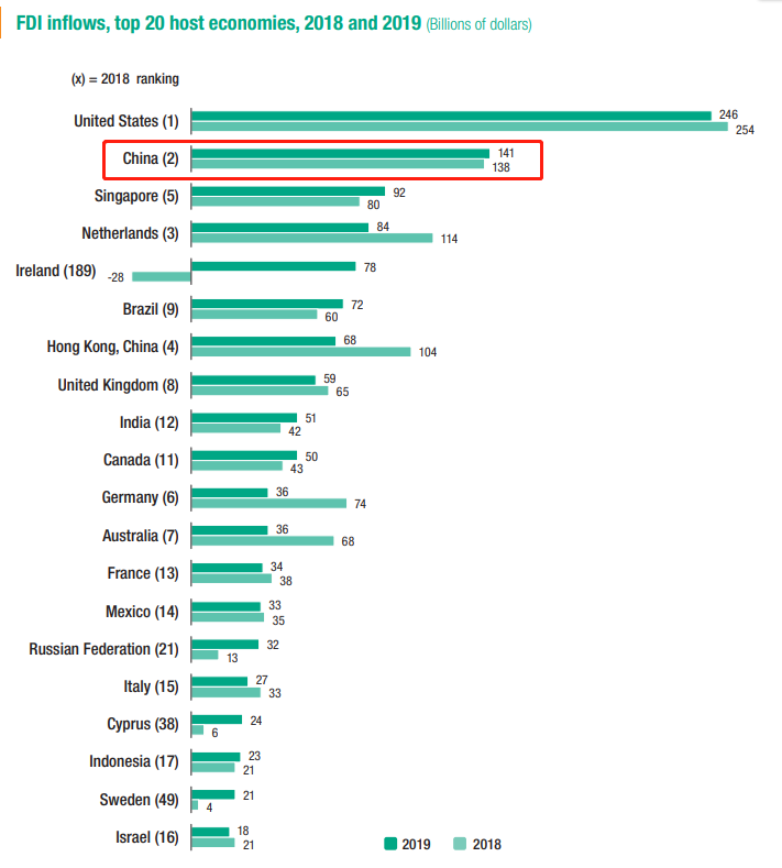 据联合国贸发会(UNCTAD)最新数据显示,2019年全球FDI为13,940亿美元,相比2018年继续下降1.3%;同期中国FDI为1400亿美元,同比增长0.7%,占全球FDI的份额进一步上升至10%,稳居世界第二。