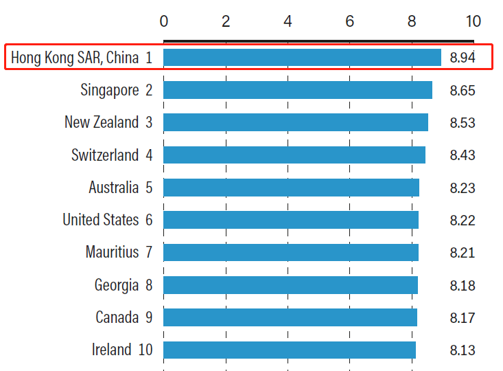 这份报告的最新综合数据以2018年的为基础,香港以8.94分的综合评分,再次位居榜首,新加坡、新西兰分别以8.65分与8.53分位居第二与第三。