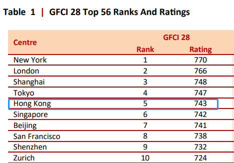 全球金融中心指数(GFCI 28)排名第五