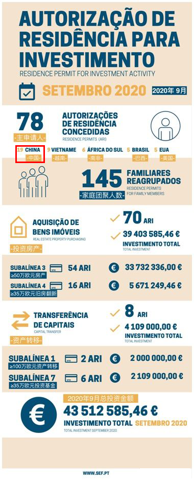 葡萄牙自从推出黄金签证项目以来一直备受到中国投资者的欢迎。近日,葡萄牙移民局公布了最新黄金签证数据:20209月共有78位主申请人和145位附属申请人获批葡萄牙黄金签证,投资额为4351万欧元。