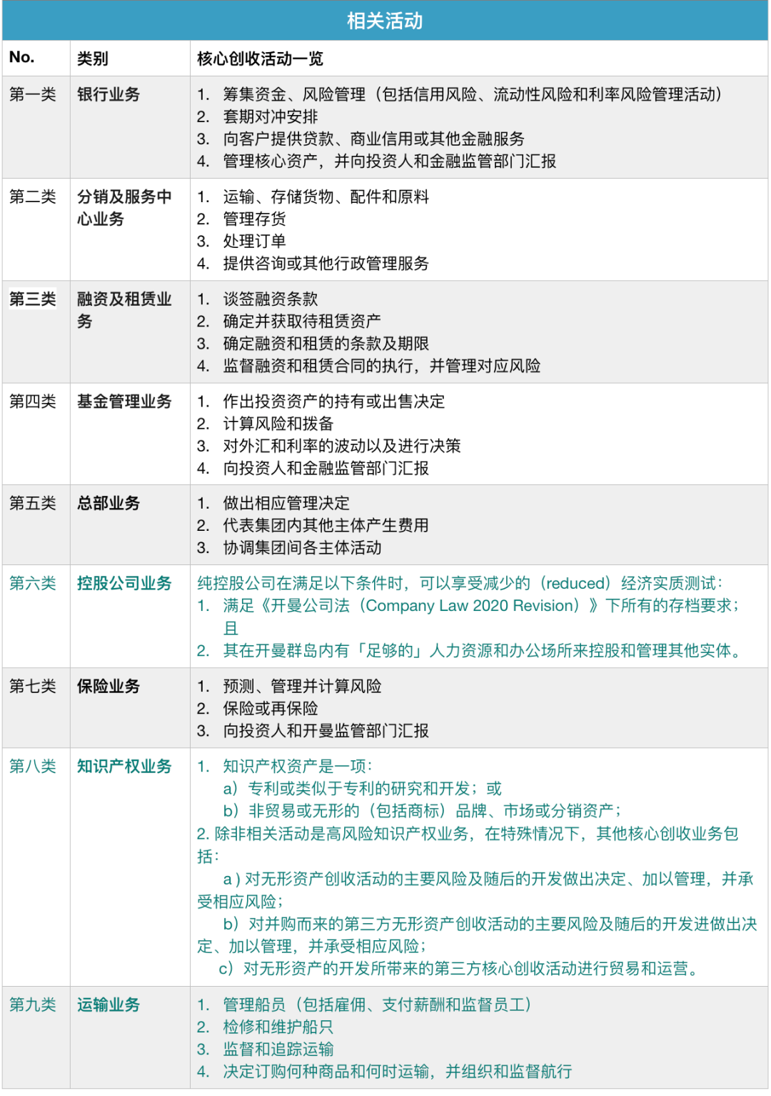 “相关活动”包括九个类别:控股公司业务、总部业务、基金管理业务、融资和租赁业务、知识产权业务、船运业务、分销和服务中心业务、银行业务、保险业务。