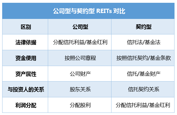 兰等国家或地区主要采用契约型,即REITs主体是基于信托/基金法律成立的一个信托契约/基金,通过发行信托受益凭证/基金份额向投资者筹集资金,并将利润以信托利益/基金红利的方式分配给投资者。