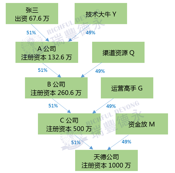 通过如上金字塔结构,我们可以发现实际控制人张三通过4级控制层、1个控制链条,以区区67.6万的出资额,即控制了天德公司1000万资金的使用和实体公司运营。