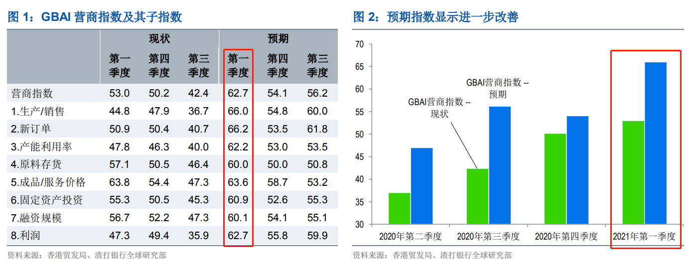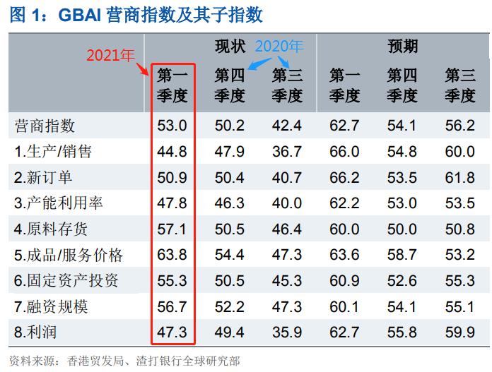 从指数看,GBAI 的经营活动的“现状”指数从2020年第四季度的50.2连续第三个季度上升至2021年第一季度的53.0,高于中性值 50,代表2021年第一季度营商信心开局强劲。