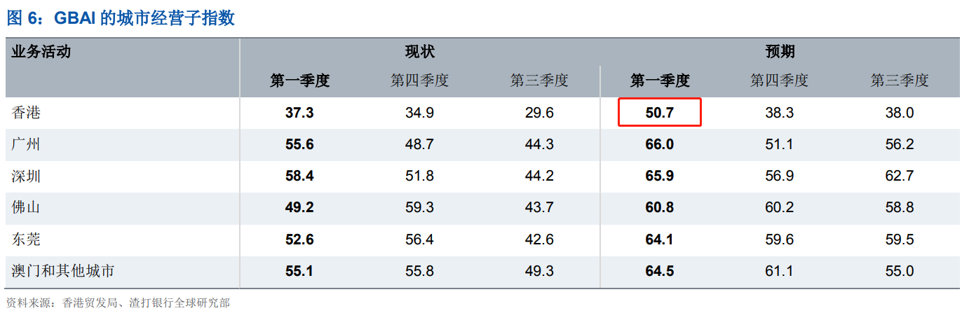 而香港终于表现出开始改善的迹象,尽管当前仍是大湾区表现较为落后,业务活动现状指数连续第四个季度低 40,但其预期指数从之前的 38.3 跃升至 50.7,与经济增长相一致。种种迹象表示,香港经济正在复苏。