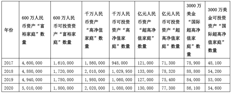 根据《2020胡润财富报告》的数据显示,2020年中国600万资产“富裕家庭”数量首次突破500万户,比上年增加1.4%;千万资产“高净值家庭”比上年增加2%至202万户;亿元资产“超高净值家庭”比上年增加2.4%至13万户。