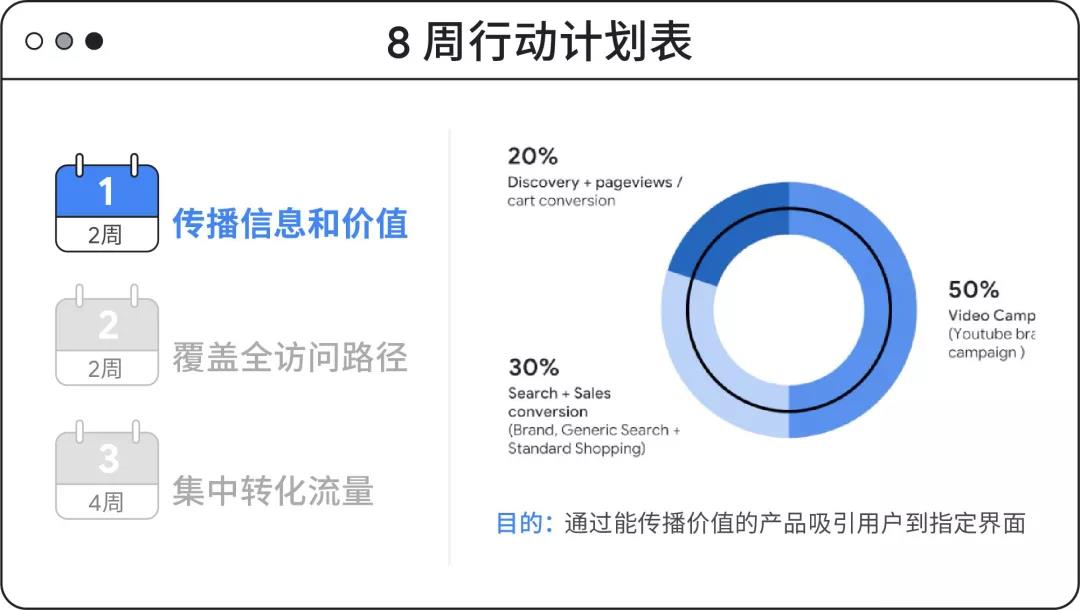 在传播价值的阶段,视频和展示类型广告占比要在 50% 以上,目的是快速捕获流量。