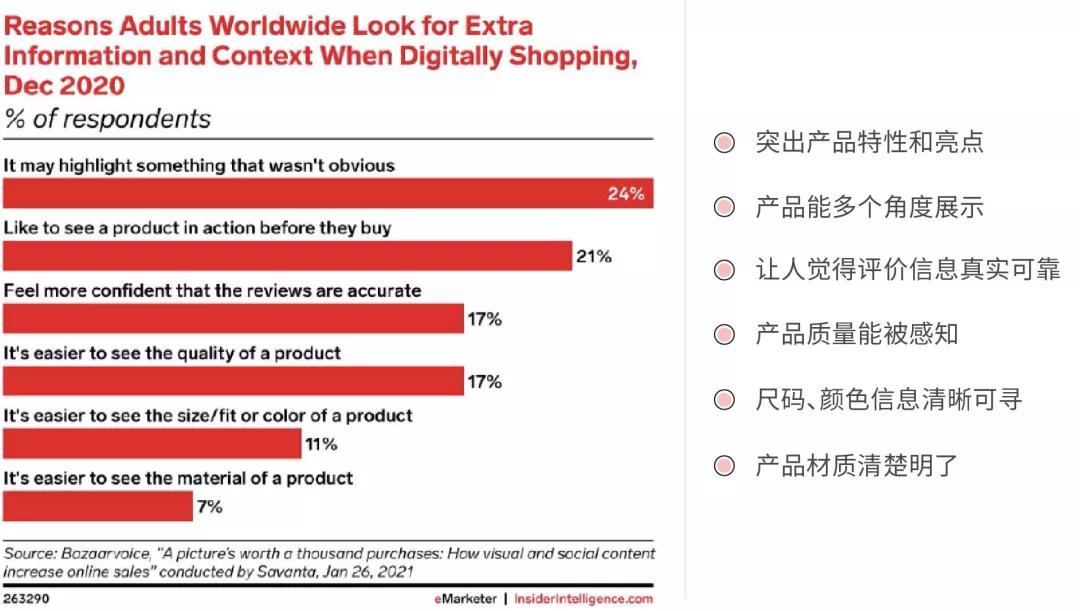 此外,营销内容也很重要。调研公司 bazaarvoice 在调研报告中指出,在过去的 2020 年,全球范围内电商用户在网上购物过程中希望获取到更多的信息和视觉体验,以下几个点可以特别关注一下: