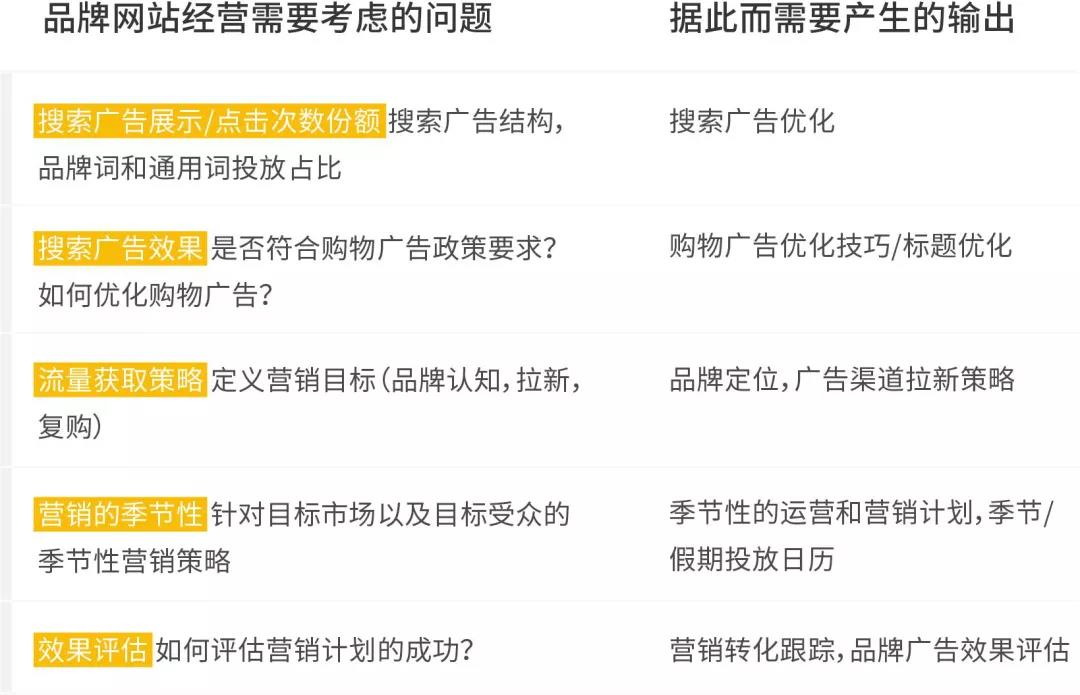 跨境电商可能听说过几十种营销策略,比如网红营销、体验式营销、社交媒体营销、视频频道建立等……但真要下手做时依然迷惑。刚起步的网站需要化繁为简,营销漏斗从大的开始筛,可以考虑先从谷歌广告开始。在选择谷歌广告的产品时,如果不知道选哪几种,可以先选搜索广告和购物广告;如果不知道投的时候重点在哪里,那请对照下方的表格,考虑清楚下面几个问题,理清头绪。