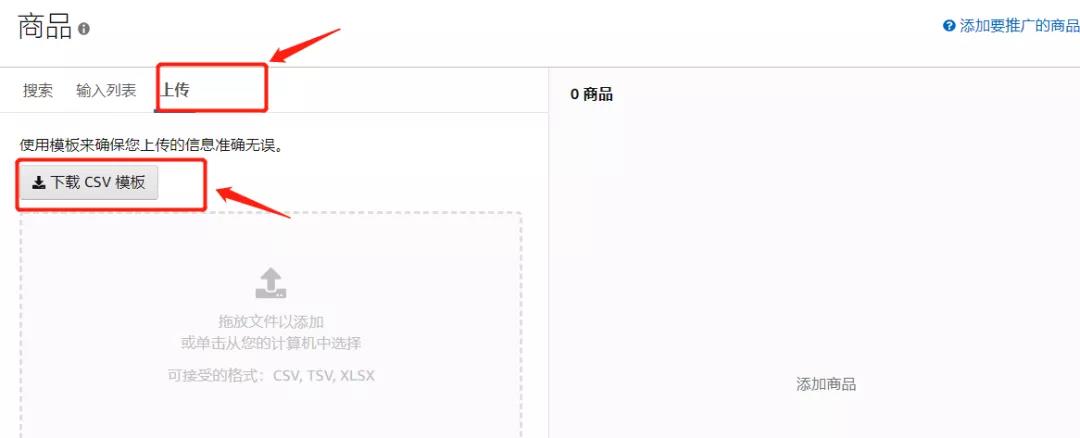 ③上传:先下载CSV模板,得到一个EXCEL表格,按照表格中的提示输入ASIN,并进行上传CSV模板。
