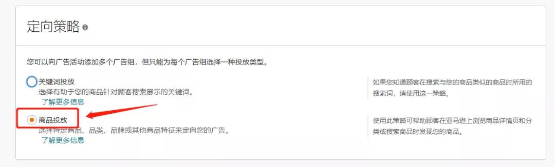 第八步:在选择好要投放商品后,在【定向策略】中,选择【商品投放】。
