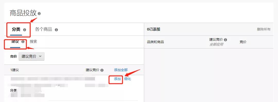 ①分类:在“分类”选项卡中,您可以根据与商品的相关性投放相应的推荐品类。按照建议竞价,设置合理的价格。