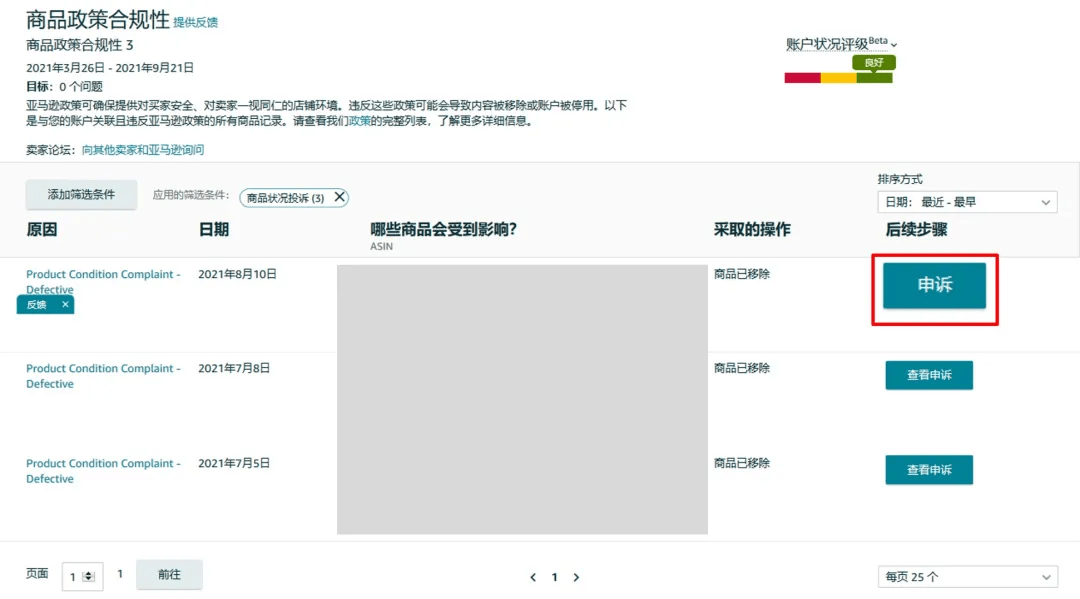 通过“商品政策合规性”页面,您可以看到违反亚马逊政策的商品记录。您可以对该页面中显示的违规问题进行申诉。