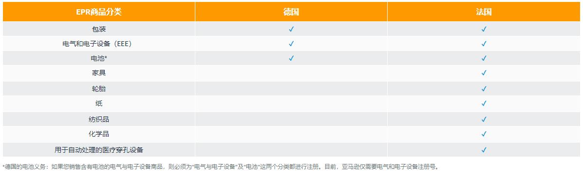 生产者责任延伸(EPR)是一项环境政策,要求生产者对其在市场上所推出商品的整个生命周期负责,即从商品设计开始到商品生命周期结束(包括废弃物收集和处理)。自 2022 年起,如果您要在法国/德国销售商品,亚马逊将有义务确认您在销售商品所在的国家/地区是否符合生产者责任延伸(EPR)的要求。因此,亚马逊将会收集并验证您的 EPR 注册号。