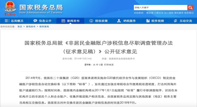 ¹ú¼Ò˰Îñ×ܾÖÓÚ 2016 Äê 10 Ô 14 ÈÕÔÚ¹Ù·½ÍøÕ¾ÉϾͷǾÓÃñ½ðÈÚÕË»§ÉæË°ÐÅÏ¢¾¡Ö°µ÷²é¹ÜÀí°ì·¨£¨Õ÷ÇóÒâ¼û¸å£©¡·¹«¿ªÕ÷ÇóÒâ¼û¡£Öйú½«ÓÚ 2017 Äê 1 Ô 1 ÈÕʵʩеÄÕË»§¿ª»§³ÌÐò£¬Ê״ζÔÍâ½»»»·Ç¾ÓÃñ½ðÈÚÕË»§ÉæË°ÐÅÏ¢µÄʱ¼äÊÇ 2018 Äê 9 Ô¡£