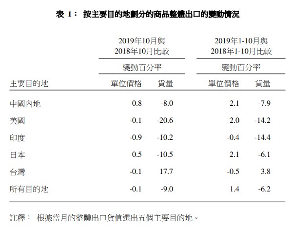 2019年10月与2018年10月比较,输往美国(-20.6%)、日本(-10.5%)及印度(-10.2%)的整体出口货量录得双位数字跌幅。同时,输往中国内地(内地)的整体出口货量亦下跌8.0%。另一方面,输往台湾的整体出口货量则上升17.7%。与此同时,输往印度(-0.9%)、美国(-0.1%)及台湾(-0.1%)的整体出口价格下跌。另一方面,输往日本(0.5%)及内地(0.8%)的整体出口价格则上升。