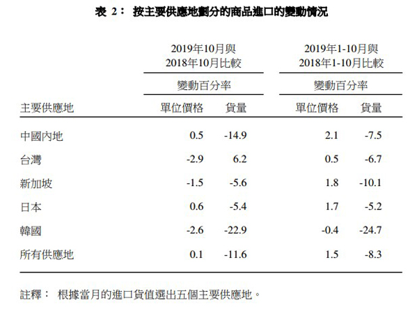 2019年10月与2018年10月比较,来自韩国(-22.9%)及内地(-14.9%)的进口货量录得双位数字跌幅。同时,来自新加坡(-5.6%)及日本(-5.4%)的进口货量亦下跌。另一方面,来自台湾的进口货量则上升6.2%。