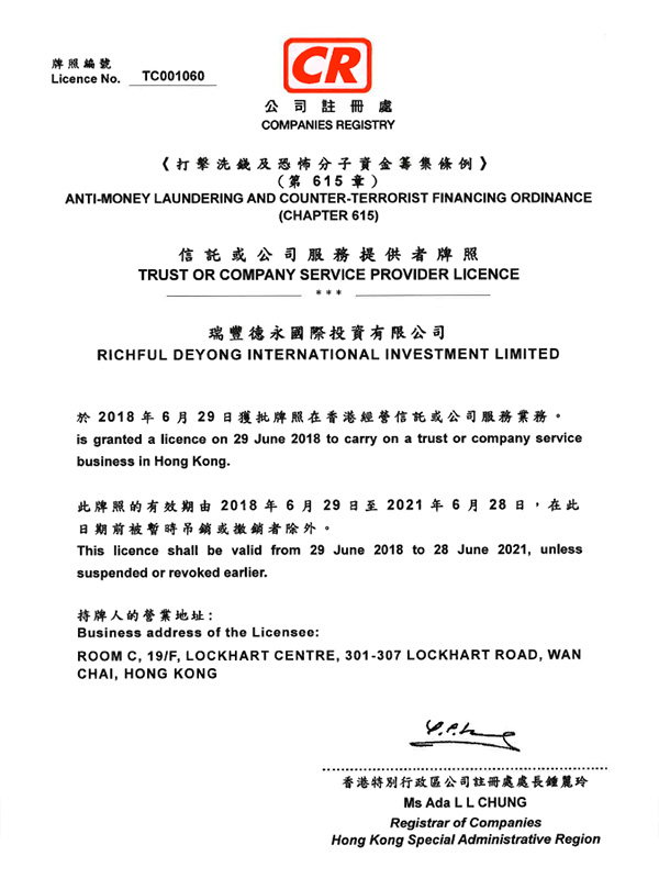 - 信托或公司服务提供者牌照编号: TC001160