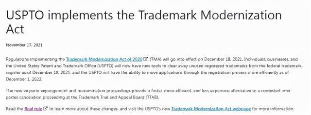 美国专利商标局在美国时间2021年11月17日发布了一则关于商标现代化法案2020的最新修订,并定于美国时间2021年12月18日正式实施。该修订主要对在实施日期后不实际使用的美国商标的权力稳定性产生影响,加速了新申请注册商标的审核速度。