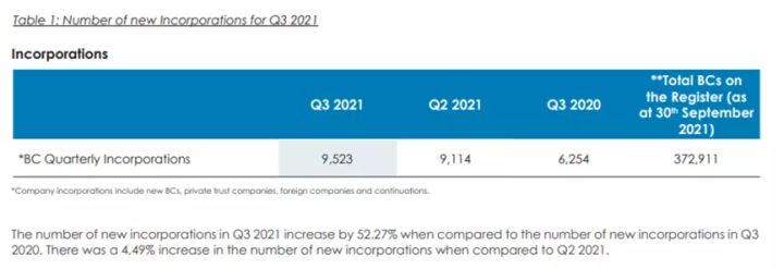 统计数据显示,2021年第三季度BCs(商业公司)新注册数量是9523家,环比增加409家,增幅为4.49%,同比增加2999家,增幅为52.27%。