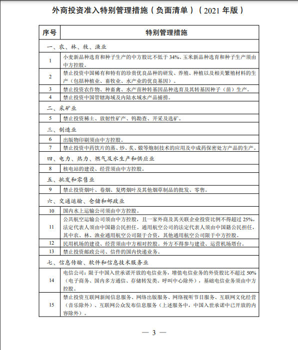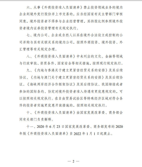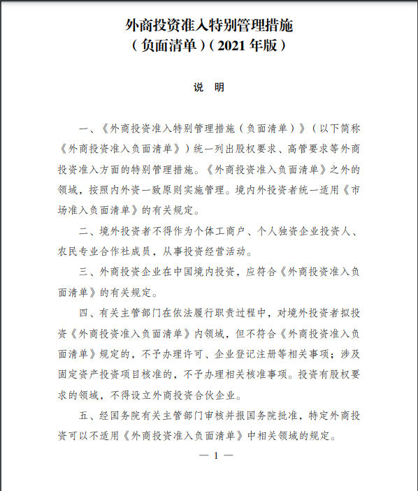 12月27日,国家发展改革委、商务部发布了《外商投资准入特别管理措施(负面清单)(2021年版)》和《自由贸易试验区外商投资准入特别管理措施(负面清单)(2021年版)》。