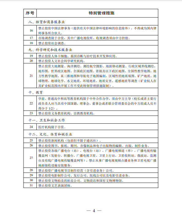 第三,提高外资准入负面清单精准度。在负面清单说明部分增加“从事外资准入负面清单禁止投资领域业务的境内企业到境外发行股份并上市交易的,应当经国家有关主管部门审核同意,境外投资者不得参与企业经营管理,其持股比例参照境外投资者境内证券投资管理有关规定执行”,由证监会和有关主管部门按规定对从事负面清单禁止领域业务的境内企业到境外上市融资实行精准化管理。