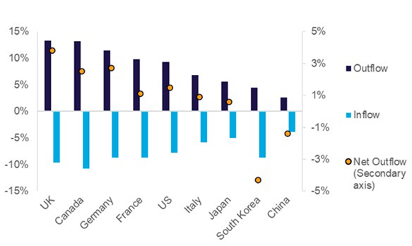 事实上,在全球人才竞赛中,英国要正在跑输其他国家,出现非常不利的人才外流情况。 如下图所见,在1996-2015期间,每年离开英国的发明家比抵达的多,相反只有韩国和中国在同一时期出现人才净流入。如果允许人才外流继续发生下去,从长远来看,英国作为创新强国的竞争力最终将下降,未来增长将收到影响而放缓。
