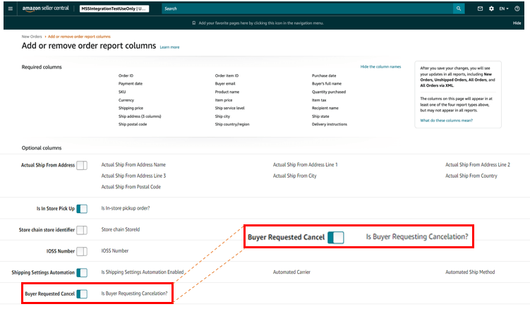 您可以通过访问添加或移除订单报告列,打开【买家请求取消】字段的切换选项,在订单报告中查看有买家发起取消请求的订单。